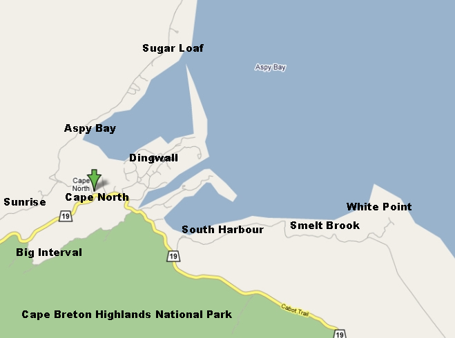 The Aspy Bay area is located at the north east corner of the John Cabot Trail. The area is is surrounded by 270 degrees of Cape Breton Highlands Mountain Range. Communities contained within this valley include Sugar Loaf, Aspy Bay, Sunrise, Cape North, Dingwall, South Harbour, Smelt Brook, White Point, and Big Interval.
